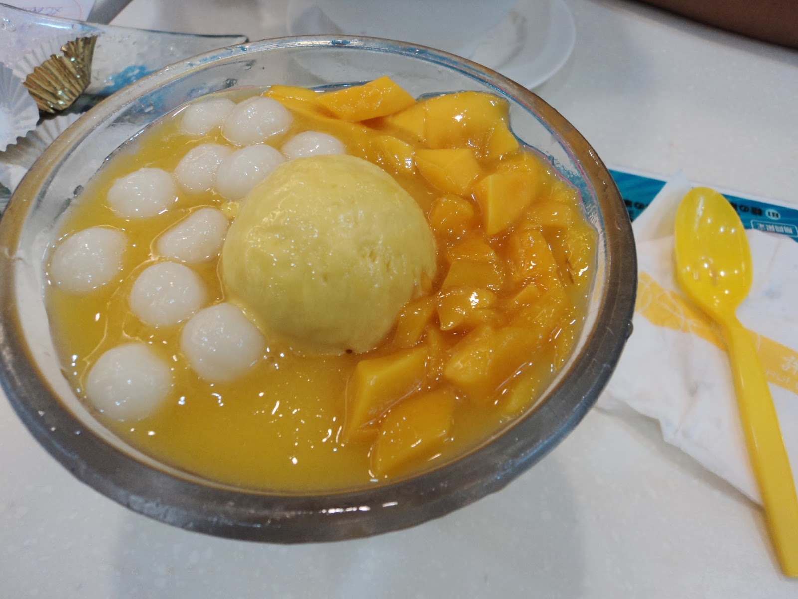 These mango desserts are from Hui Lau San/Sweet Moment. This one is the mango and white jelly dessert with mango sorbet. They also have other desserts such as taro pudding. We ordered three desserts there that costed about $100 altogether (HK dollars), which is only about £8-9!
