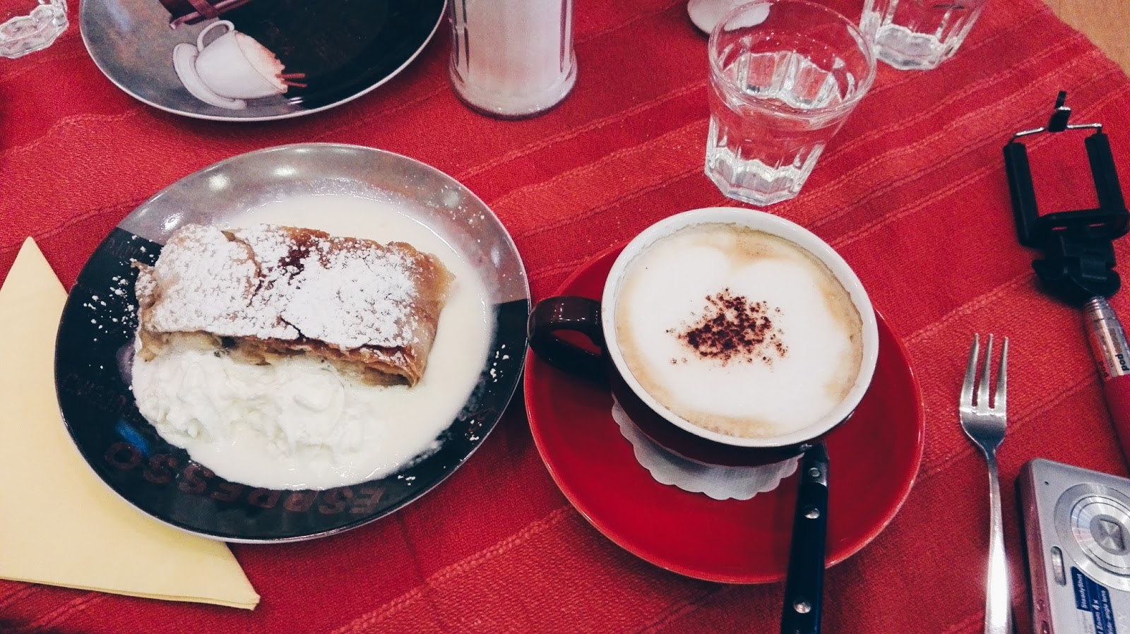 We went to another café and I tried Apfelstrudel (apple strudel), which was very sweet but tasty! Apfelstrudel is a common dessert in Austria, and it appears in many restaurants and cafés.