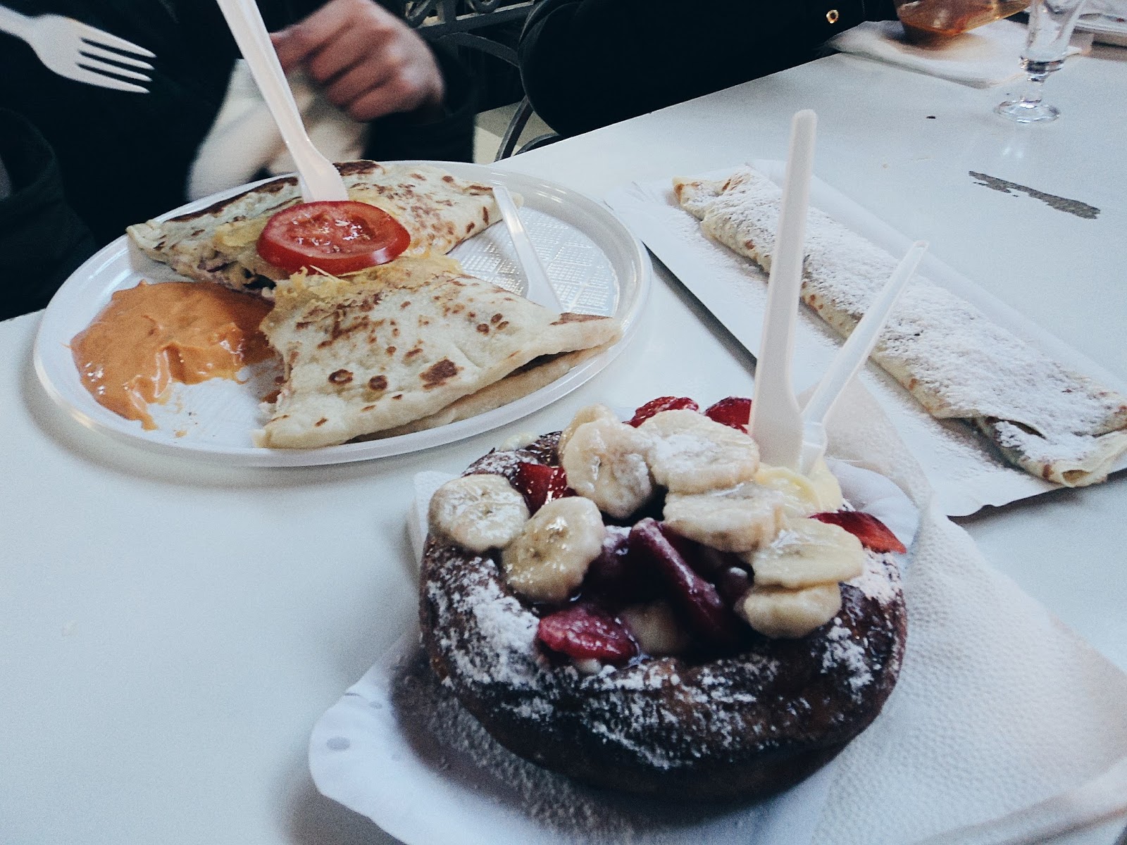 Mine was more like a doughnut not a pancake, and it had a vanilla filling. I had bananas and strawberries as the toppings 😛 It was so yummy! My friend on the other hand had a savoury kind of pancake!
