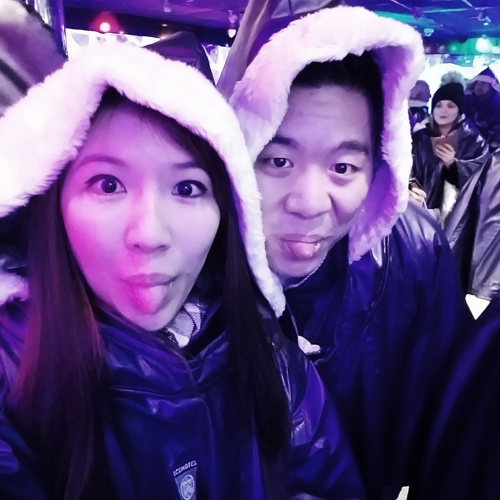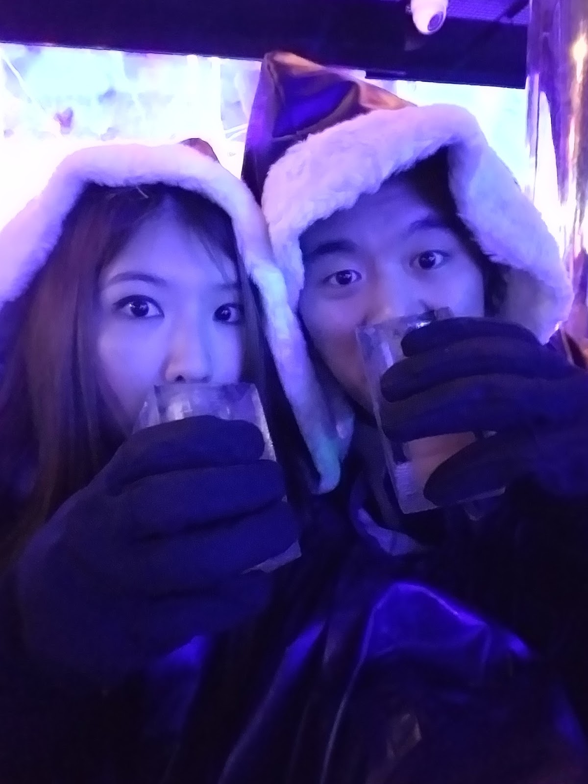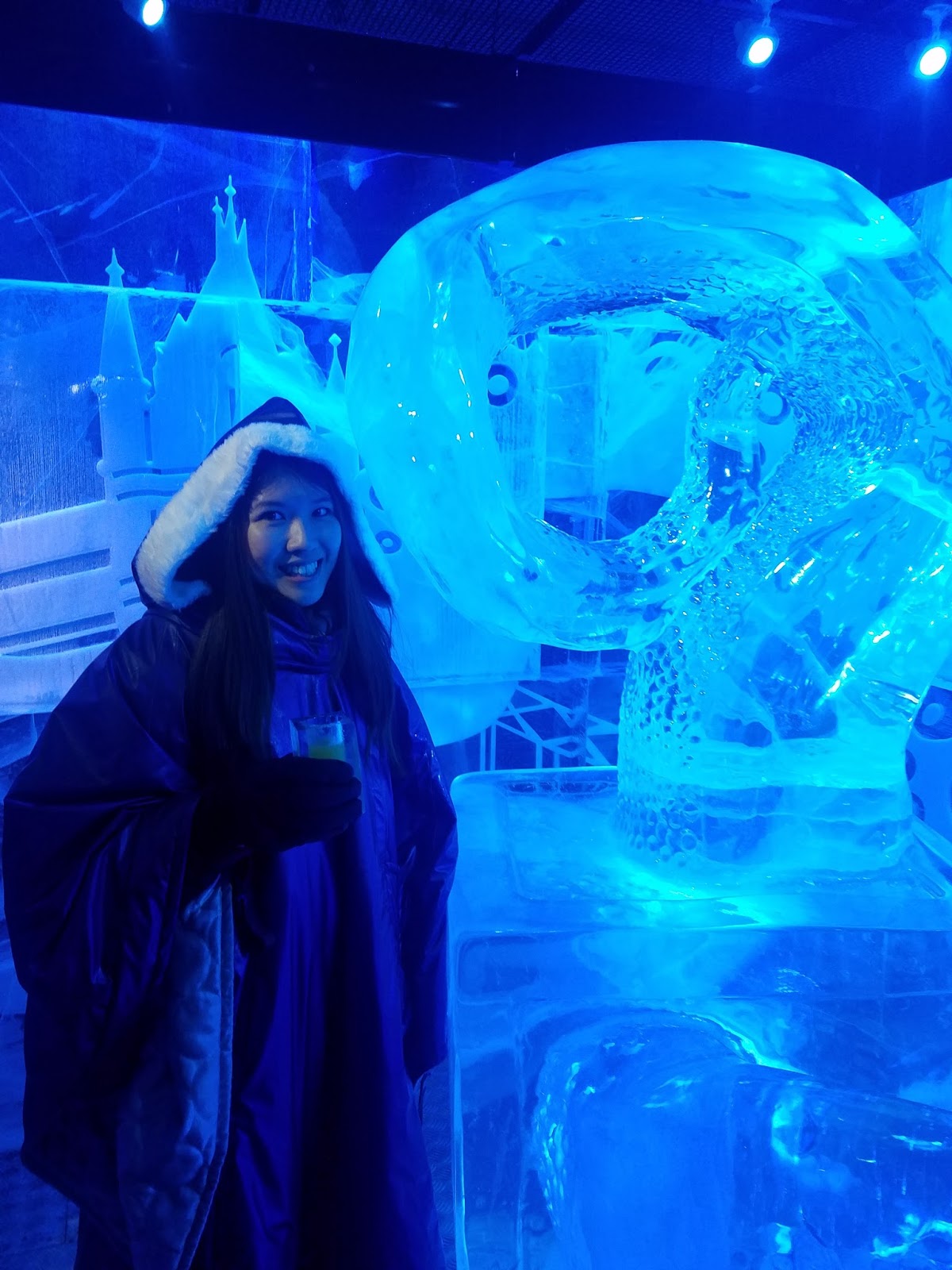 It was pretty cold inside, even holding my cocktail glass with my gloves on! But the cloak definitely helped. The interior was lit up with lights that kept changing colour, there were ice sculptures (the theme this year was ‘Wild in the City’) and a few tables. I was a bit surprised that there were no chairs/bar stools to sit on, and the place was a lot smaller than I thought.